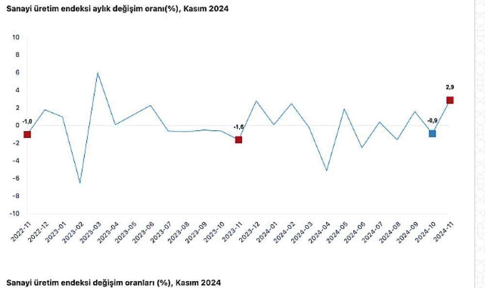 Sanayinin alt sektörleri incelendiğinde, 2024 yılı Kasım ayında madencilik ve taş ocakçılığı sektörü endeksi bir önceki aya göre %2,8 arttı, imalat sanayi sektörü endeksi %3,0 arttı ve elektrik, gaz, buhar ve iklimlendirme üretimi ve dağıtımı sektörü endeksi %2,0 arttı.